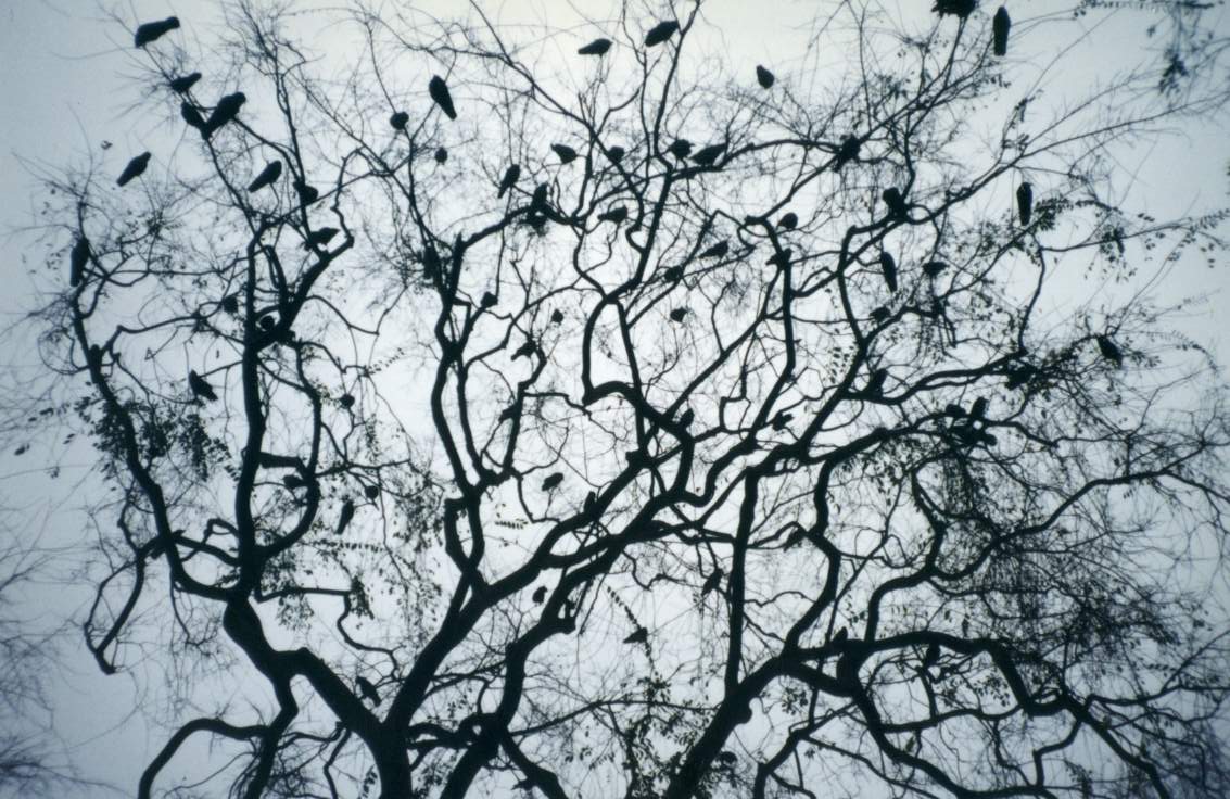 I had dreams of being pulled out to sea by storm waves. Woke up early and went out to the park. Neighbor was walking his dog. Told me there was a big car wreck down on Stadium Way. Went to the top of the hill to look. Cold fog hung around the trees. The evergreens were dead and brown. Marked with an X in spray paint; the city’s gonna come cut them down. Scotch pines. The tree my dad planted in the yard to commemorate my birth. That one was cut down too. Across the valley a murder of crows roosted on a dead eucalyptus. They were 500 yards away but as soon as I looked they flew off. Down on the road, fifteen fire trucks. A station wagon had hit a palm tree. It was spun around backward, crushed. All four doors laying on the grass, cut off by the jaws of life.